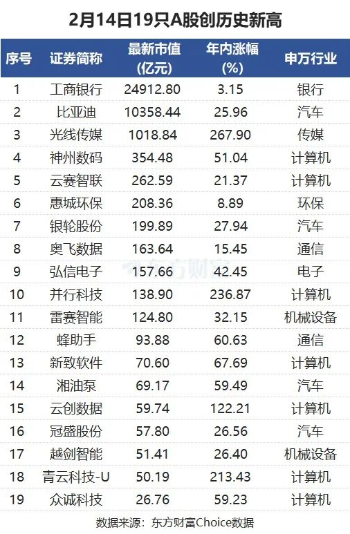 包括比亚迪在内,东方钞票Choice数据败露,周五A股有19只个股创出历史新高。按市值排序,还有工商银行、明后传媒、神州数码等股票。