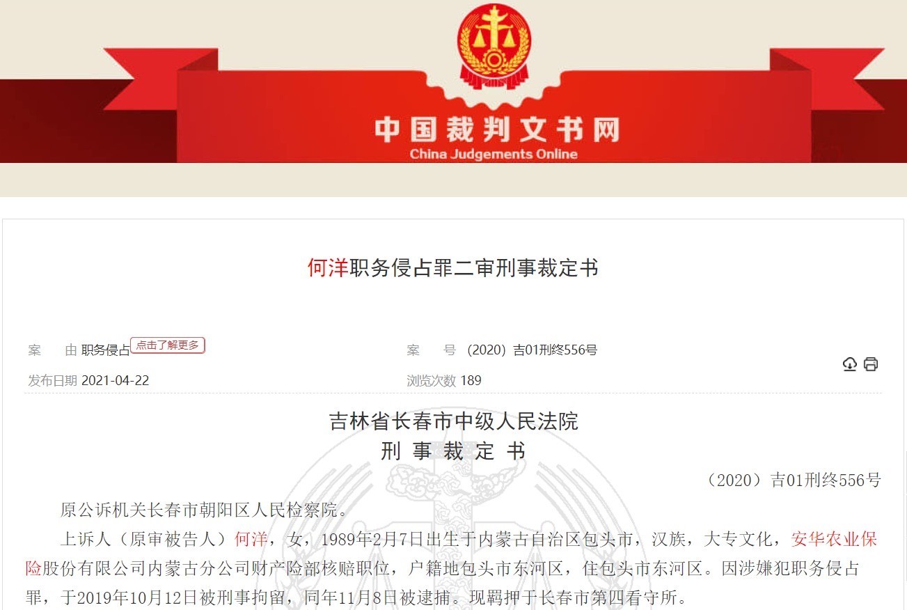 金融界燕梳盘考院查询中国裁判文书网发现,何洋(女),1989年2月7日出身于内蒙古自治区包头市,安华农业保障内蒙古分公司财产险部核赔职位,因涉嫌犯职务侵占罪,于2019年10月12日被刑事拘留,同庚11月8日被逮捕。